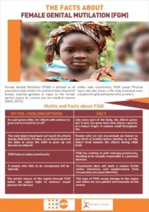 FGM is defined by WHO as all procedures involving partial or total removal of the external female genitalia or other injury to female genital organs for non-medical reasons. Often referred to locally as female circumcision, the practice is deeply rooted in tradition and sustained by myths— including the belief that it curbs promiscuity.