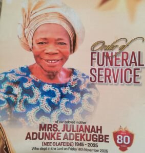 Well-wishers and family members have continued to attest to the exemplary life of Mama Julianah Adunke Adekugbe, who passed away on Friday, November 14, 2025, at the age of 80.